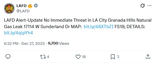 On the same day, the LAFD tweeted about a leak in northern Granada Hills.
